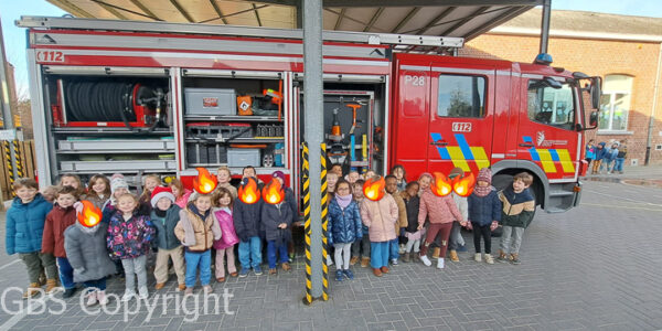 We hebben heel wat meer geleerd over de politie en de brandweer. We hebben in de klas een politiekantoor gemaakt met ook een cel voor de boeven. Ons poppenhuis stond ook in brand. De brandweer kwam snel blussen. Kijk maar
